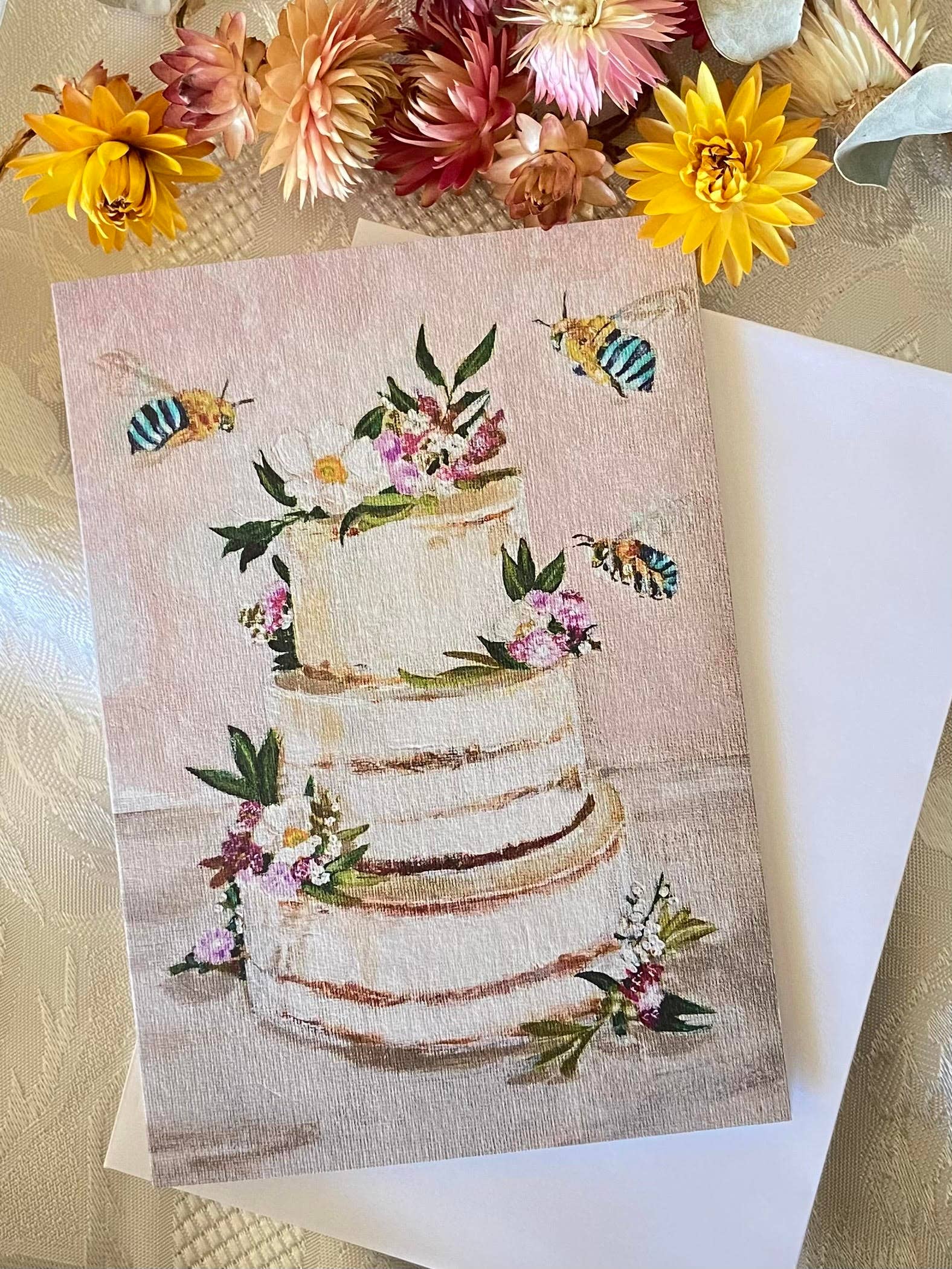 Elevate your well-wishes with our Floral Wedding Cake Card. Featuring exquisite flowers and elegant insects, this 105mm x 148mm greeting card is printed on 100% recycled premium stock and comes with a white envelope in a protective cello bag. Blank inside, it's the perfect choice for a wedding or bridal shower. Made and designed in Australia.