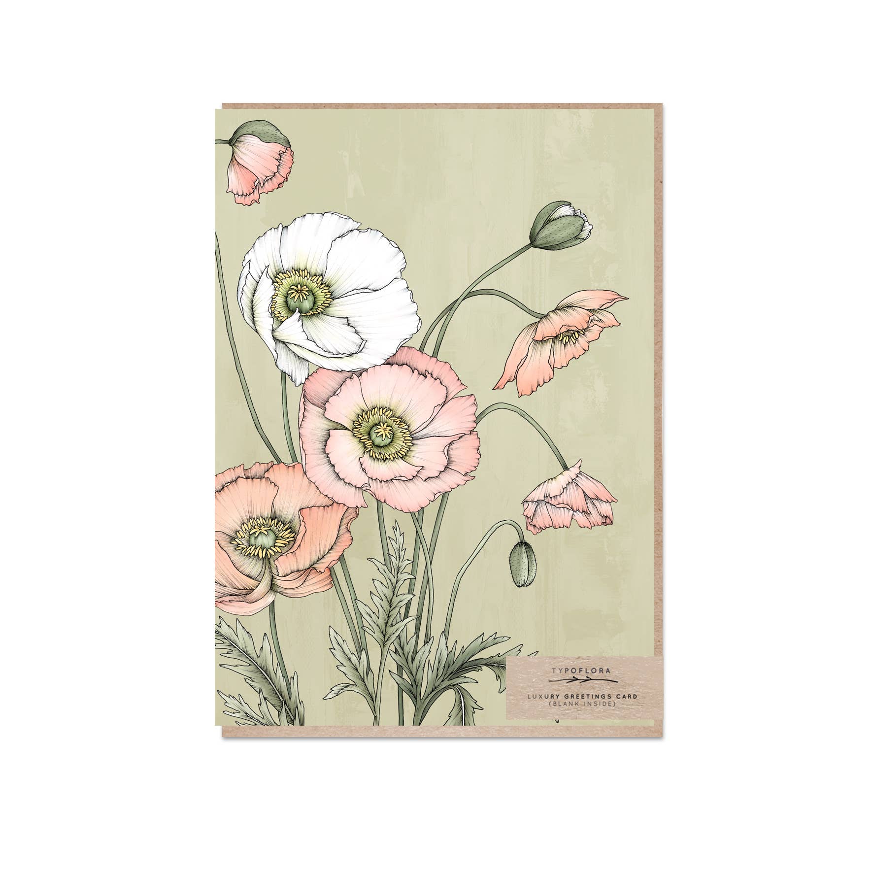 Experience the luxurious charm of Poppies on Sage Portrait Card, featuring hand-drawn botanical illustrations of delicate poppies on a sage background. These elegant notecards are perfect for any occasion, adding a touch of sophistication to your correspondence. Our A6 greeting card (105 x 148mm folded) boasts a blank interior, allowing for a personalized message. Professionally printed in full color on environmentally responsible, carbon-neutral 300gsm stock, each card comes with a brown envelope featuring a foiled flap and is individually packaged in a clear protective sleeve, making it an exclusive and thoughtful gift.
